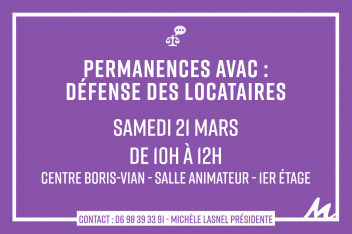 Si vous êtes locataires, vous vous posez des questions, vous rencontrez des problèmes, etc.. n'hésitez pas à venir à cette permanence, vous serez les bienvenus.